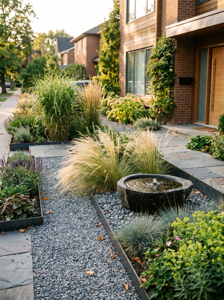 Swap out a struggling grass lawn for a crisp gravel front garden, interplanted with structural ornamental grasses and a sleek stone water bowl feature. Why it works: The contrast between soft, waving grasses and hard gravel is highly architectural, delivering a sophisticated low maintenance front garden. Best home style: Mid-Century Modern or Contemporary architecture. Styling tips: Stick to a strict monochromatic color palette. Use heavy steel decorative edging to keep the gravel perfectly contained.