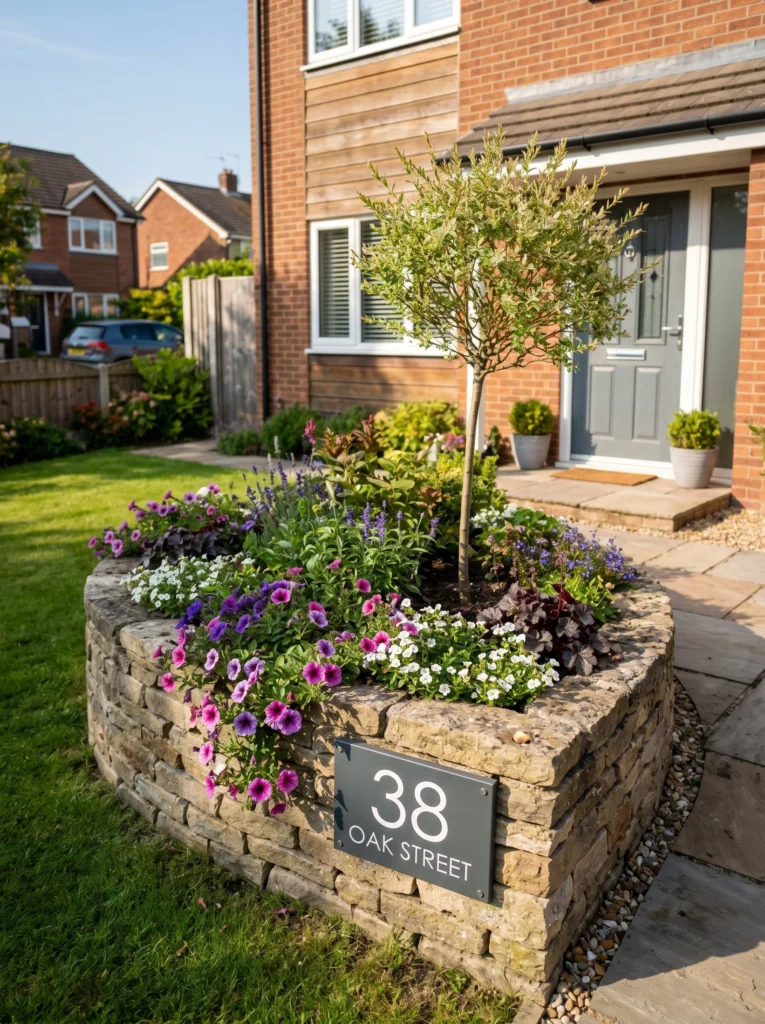 Build a low stone or timber raised front bed right at the corner of your driveway and path, anchoring the yard with a statement house number feature bed. Why it works: A flat yard can feel one-dimensional. Raised beds break up the plane and provide a clear, visible anchor point. Best home style: Ranch, Split-level, or Suburban transitional homes. Styling tips: Plant a gorgeous dwarf Japanese maple or a striking specimen plant in the center, surrounded by trailing seasonal color beds.
