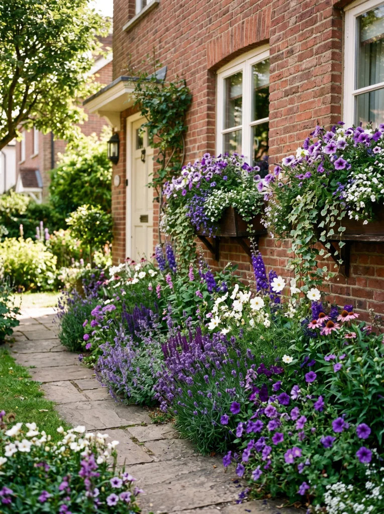 Turn that awkward skinny strip of dirt between your sidewalk and house into a lively bed of native pollinator plants, paired with matching window boxes above. Why it works: It maximizes literally every inch of soil, turning a frustrating dead zone into an eco-friendly focal point. Best home style: Urban townhomes, Terraced houses, or historic city homes with tight street access. Styling tips: Use drought-tolerant natives like lavender, coneflowers, and salvia. Keep the tallest plants against the brick wall.