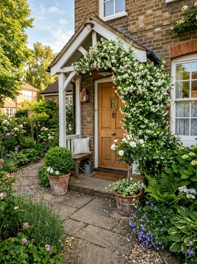 Train elegant climbing vines like jasmine, clematis, or climbing roses over your front door or porch columns, anchoring the base with small container displays. Why it works: It draws the eye directly upward and beautifully frames your home’s most important exterior feature: the entrance. Best home style: Cottage, Tudor, or Victorian. Styling tips: Install a sturdy wire trellis system before the plant gets too big. Coordinate the flower color with your porch décor and front door paint.