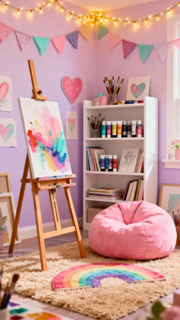 This artistic corner is a dream space for any young creator. With colorful artworks on the walls and an easel ready for action, it encourages imagination and self-expression. The cozy setup, complete with comfy seating and plenty of art supplies, makes it a perfect spot to let creativity flow.