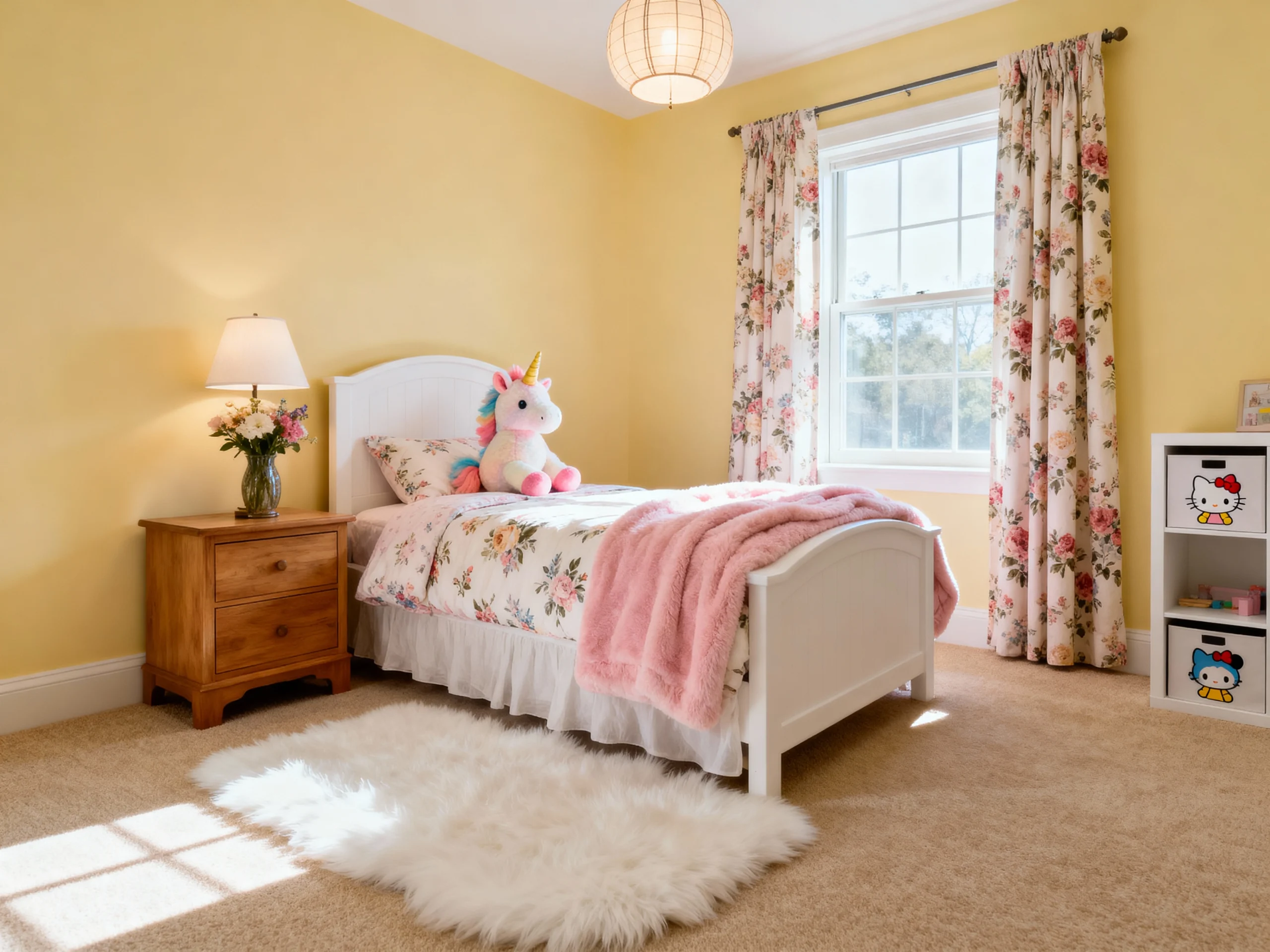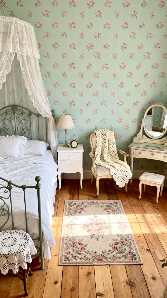 This cozy bedroom is a lovely nod to vintage style with its floral wallpaper and warm lighting. The rocking chair invites you to relax and enjoy a good book, while the charming furniture adds character to the space. Bright green plants peeking from the window bring a touch of nature inside, making it a delightful retreat for any preteen.