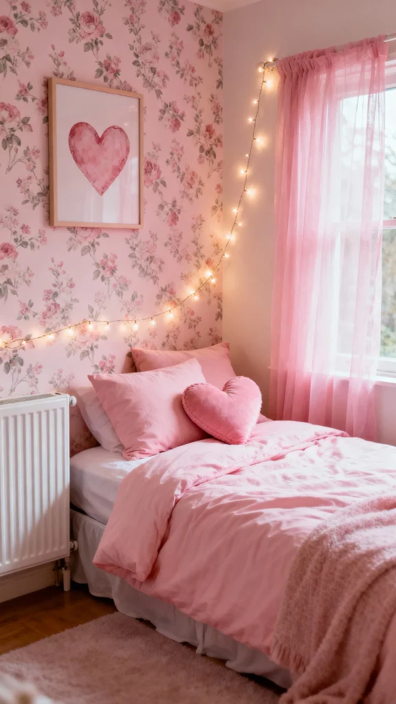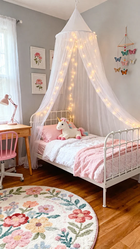 This bedroom feels like a scene from a fairy tale. With soft pink hues, fairy lights, and flowing drapes, it’s a cozy spot for daydreaming and creativity. Every corner invites a sense of magic, making it the ideal space for any ten-year-old girl.