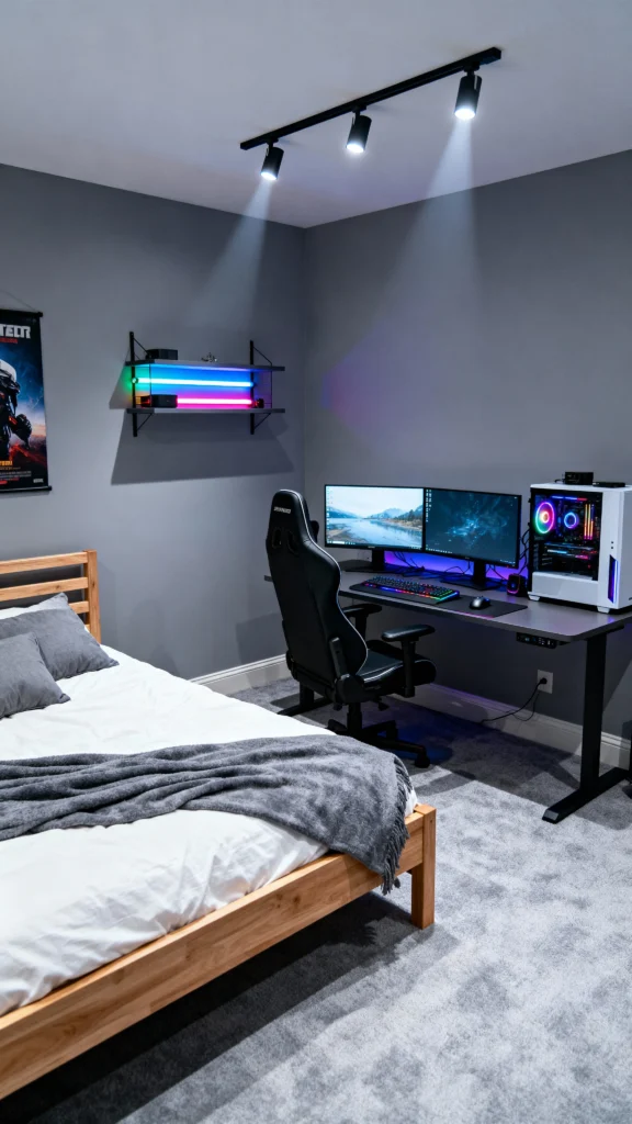 This bedroom layout truly captures the spirit of a gamer’s paradise. With dual monitors and colorful LED lights, it sets the perfect mood for gaming sessions. Cozy touches, like the plush rug and comfy bedding, make it a welcoming retreat after a long day of play.