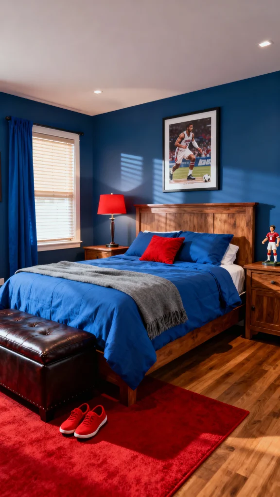 This sporty bedroom design is all about fun and energy. With vibrant colors and action-packed artwork, it inspires movement and creativity. The mix of cozy bedding and playful decor makes it a perfect hangout for any active preteen.