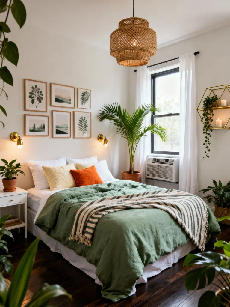 Create an organic oasis by filling your corners with tall, leafy majesty palms and trailing ivy. Curate a gallery wall above the bed using light wood frames and nature-inspired prints to draw the eye upward. Flank the bed with brass sconces for warm, functional reading light. Layer earthy linen bedding in sage and terracotta tones to mimic the outdoors. Install a woven rattan pendant light overhead to add natural texture. Keep your nightstands open and airy to maintain that relaxed, effortless bohemian flow.