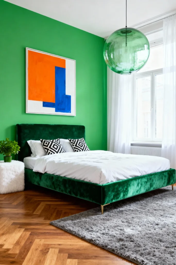 Be fearless and paint your feature wall a vibrant, saturated Kelly green. Contrast this immediately with a piece of bold, abstract art featuring bright oranges and blues. Anchor the room with a lush, green velvet platform bed that blends into the wall for a seamless look. Hang a translucent, green glass globe light to keep the color story going without blocking the view. Soften the bold colors with a high-pile grey shag rug and classic herringbone wood floors.