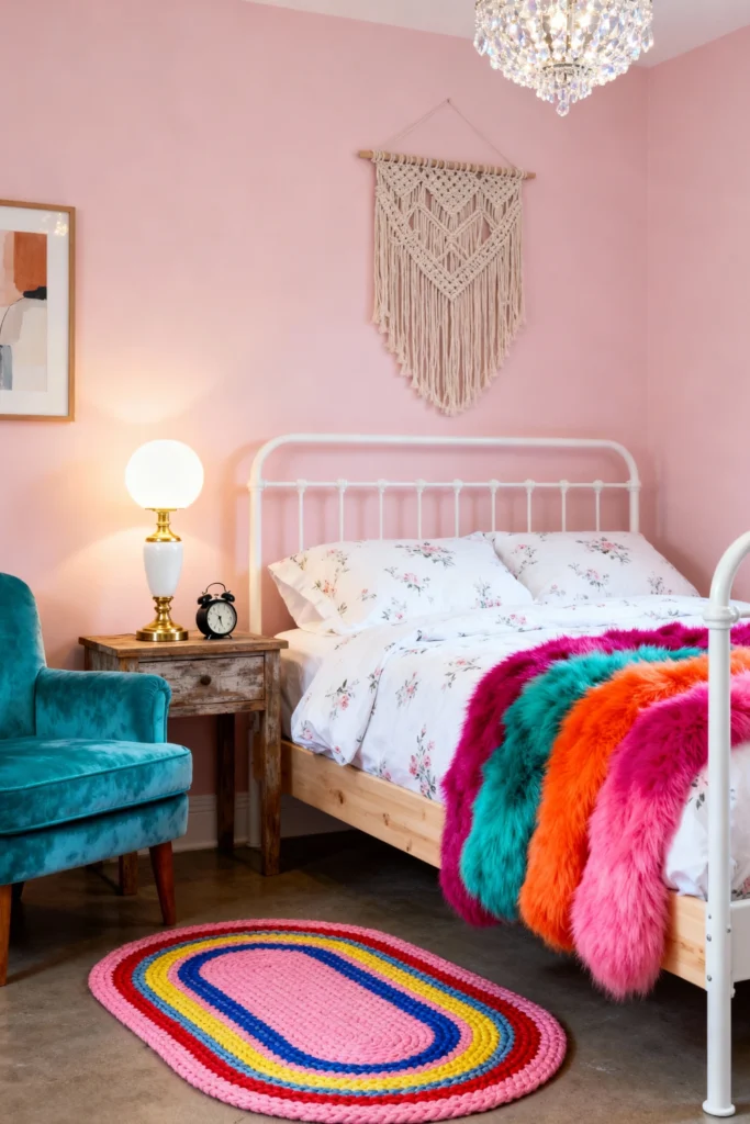 Paint your walls a soft bubblegum pink to set a cheerful foundation. Layer the bed with floral sheets and a row of faux-fur throws in a gradient of rainbow colors. Hang a large, cream macramé piece above the headboard to add bohemian texture. Place a bright, oval braided rug in blue, yellow, and pink stripes to anchor the seating area. Choose a velvet armchair in a shocking teal to clash intentionally and beautifully with the pink surroundings. This room is pure joy.