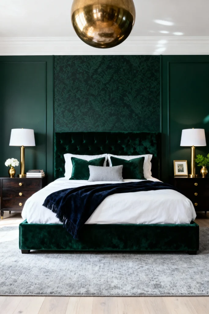Commit to drama by drenching your walls and molding in a deep, moody forest green. Center the room with an oversized, tufted velvet headboard that screams luxury. Hang a massive, hammered brass pendant light to act as the room’s jewelry. Symmetrically place dark wood nightstands with matching brass lamps to create a sense of order and elegance. distinct wallpaper pattern inside the wall molding adds depth without breaking the color palette. Keep the bedding crisp white to ensure the dark green doesn’t feel too heavy.