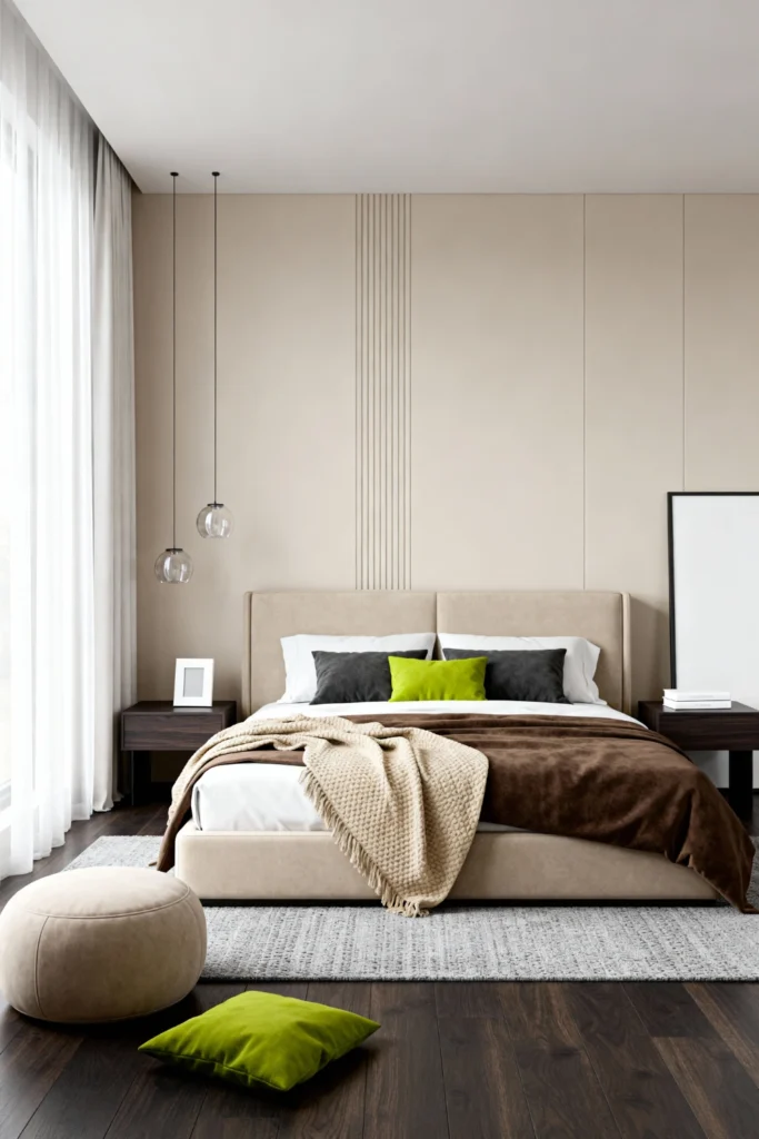 Stick to a strict monochromatic palette of creams, beiges, and warm chocolates for ultimate visual calm. Install floor-to-ceiling vertical slat detailing behind the bed to add architectural interest without color. Select a low-profile upholstered bed frame to keep the sightlines grounded. Flank the bed with dark floating nightstands and sleek, glass pendant lights that hang low from the ceiling. Use a large, leaning art piece with a simple black frame to break up the beige expanses. This is minimalism done with warmth.