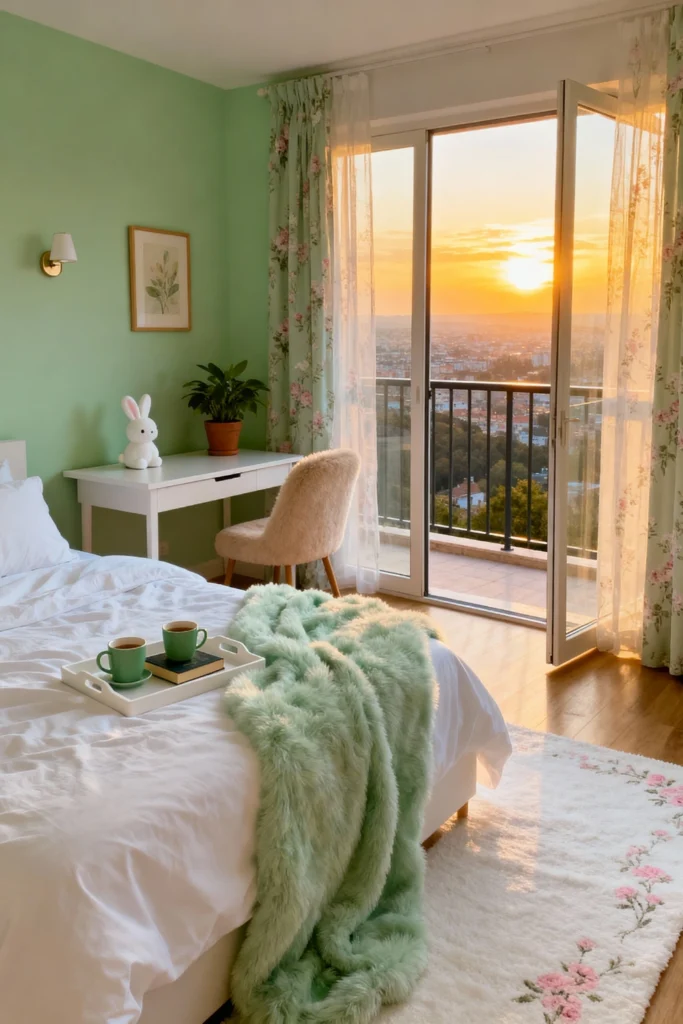Paint your walls a soft, refreshing mint green to maximize the natural light pouring in. Frame your balcony doors with sheer, floral-patterned curtains that dance in the breeze. Layer your bed with a fluffy, seafoam-green faux fur throw for immediate texture and comfort. Place a simple white writing desk near the view, perfect for morning journaling. pull up a plush, textured chair to soften the clean lines. Let the golden hour sunlight be your main accessory, turning the room into an airy, romantic escape.