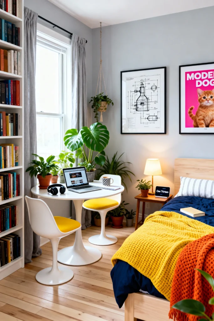 Carve out a multi-purpose nook with a classic white tulip table and vibrant yellow mid-century chairs. Surround yourself with floor-to-ceiling white bookshelves packed with colorful spines to showcase your personality. contrast the white walls with a deep navy duvet and a chunky, mustard-yellow knit throw. Hang bold, graphic art prints to inject a sense of playfulness. Incorporate plenty of lush greenery, like a Monstera, to bridge the gap between the retro furniture and the modern workspace. This is a room designed for creativity.