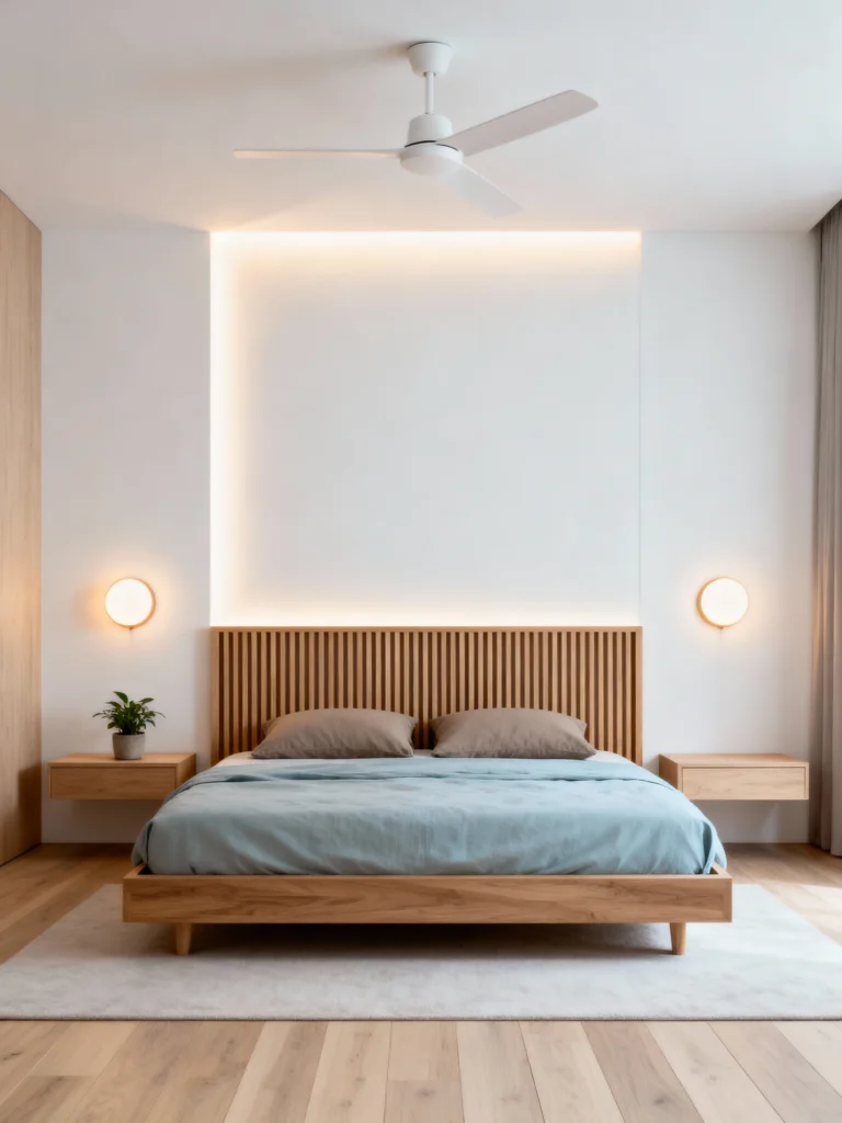 Focus on clean lines with a slat-wood headboard that extends the full width of the wall. Install hidden perimeter lighting behind a false wall to create a soft, halo-like glow instead of harsh overheads. Choose a floating wood bed frame to make the floor space feel expansive. Keep the bedding in muted earth tones like slate blue and taupe. Mount simple, circular wall sconces that mimic the moon. Keep the room entirely free of clutter to maintain a meditative, spa-like atmosphere.