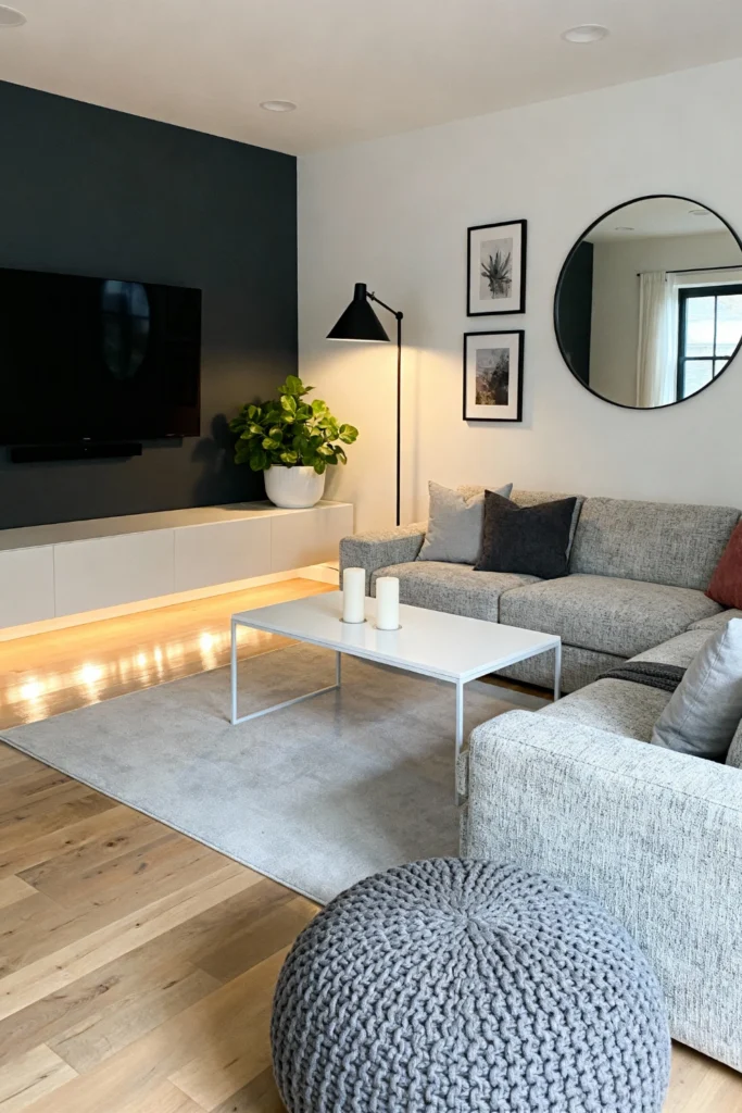 Install a floating white media console that spans the wall, utilizing under-cabinet lighting to make it feel weightless. Paint the TV wall a solid matte black to camouflage the screen and create a cinematic effect. Balance the dark wall with a large, round mirror on the adjacent white wall to reflect light. Select a textured grey sectional sofa and a minimalist white metal coffee table. Add a large, grey knitted pouf for flexible seating and keep the flooring in light natural wood to keep the room feeling airy and spacious.
