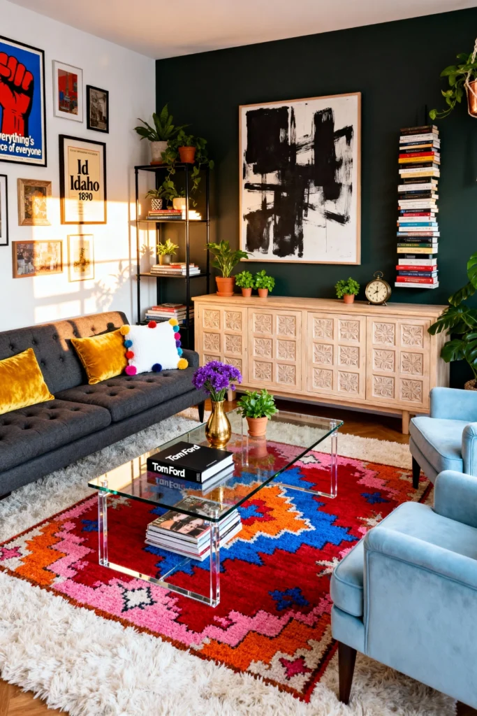 Create a gallery wall filled with an eclectic mix of vintage posters and typography art to showcase your personality. Anchor the room with a tufted, dark grey mid-century sofa topped with velvet cushions in mustard and teal. Lay down a shaggy, Moroccan-style rug featuring bold neon pinks and oranges to define the lounge area. Use a clear acrylic coffee table to keep the visual flow open and airy. Add a light-washed, carved wooden sideboard and surround it with plenty of potted plants to breathe life into the corner.