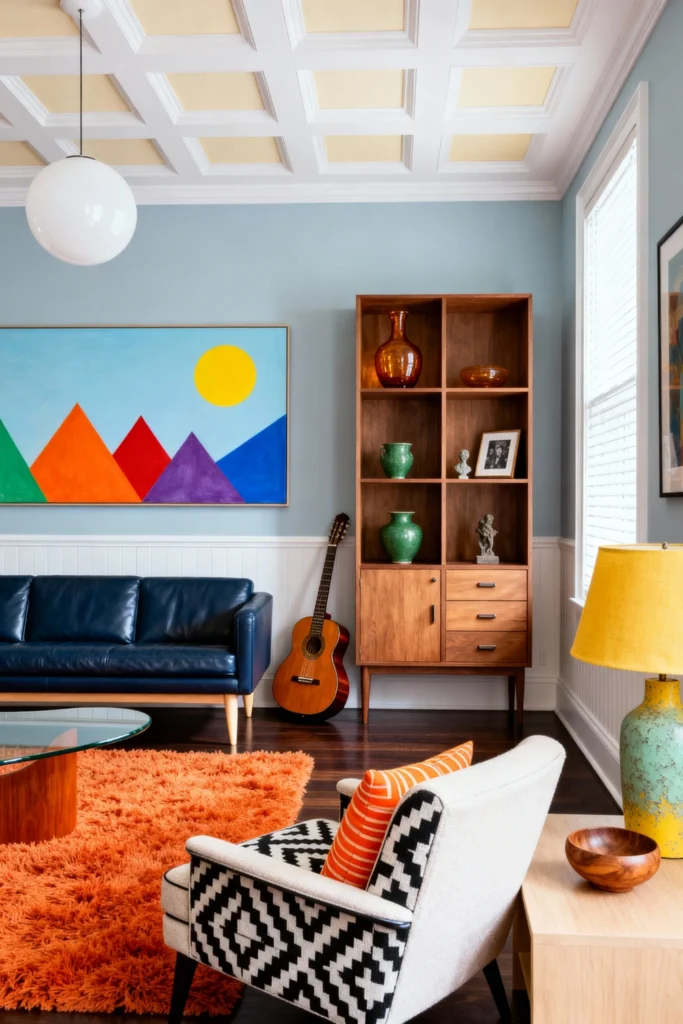 Look up and add interest to your ceiling with a white coffered design against a soft yellow background. Paint the walls a soothing sky blue to contrast with a bold, oversized abstract painting in primary colors. select a sleek, navy blue leather sofa raised on wooden legs for that classic 1960s silhouette. Place a high-pile, shaggy orange rug on the dark wood floor for a texture shock. Finish with a glass-top noguchi-style table and a vintage wooden cabinet to display your colorful glass vase collection.