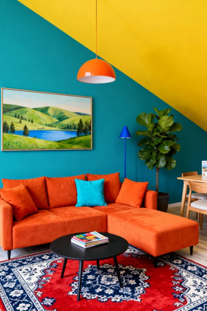 Paint a daring diagonal line across your wall, splitting the space into vibrant teal and sunny yellow zones. Choose a bright orange sectional sofa to act as the room’s main statement piece against the teal backdrop. Place a simple black round coffee table in the center to ground the explosion of color. Use a patterned rug with traditional motifs in red and navy to add a layer of complexity. Add a striking, electric blue floor lamp and a tall fiddle leaf fig tree to balance the height of the room.
