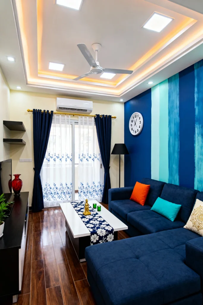 Design a false ceiling with warm cove lighting to give the room a soft, architectural glow. Paint vertical stripes in varying shades of ocean blue and teal on one accent wall to add height and visual rhythm. Select a deep blue L-shaped sectional that invites lounging and pair it with contrasting bright orange and turquoise cushions. Lay down a sleek, white rectangular coffee table with a floral runner for a touch of elegance. Keep the floor glossy and use heavy, dark blue drapes to frame the balcony entrance perfectly.