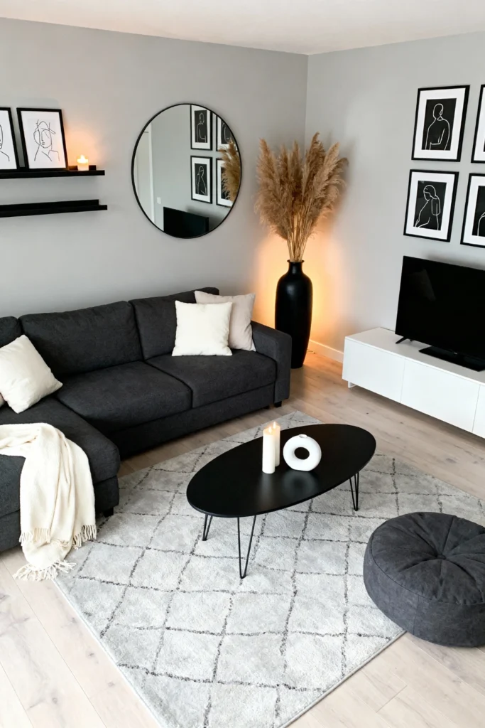 Stick to a strict greyscale palette to achieve ultimate calm and simplicity. Hang a grid of black-and-white line art prints to create a modern, organized focal point. Soften the look with a large vase of tall, fluffy pampas grass in the corner, glowing with warm backlighting. Choose a charcoal grey sectional and drape a cream-colored throw blanket over the edge for texture. Place a diamond-patterned grey rug on the light wood floor and finish with a simple black oval coffee table and a dark grey fabric pouf.