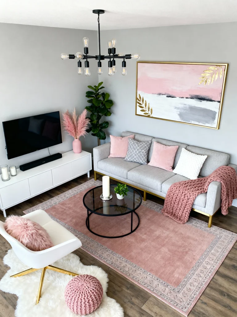 Embrace the softer side of design with a palette of greys and dusty pinks. Hang a large abstract canvas featuring blush, white, and gold leaf textures above the sofa. Arrange a light grey sectional with an assortment of faux fur and pink velvet throw pillows. Drape a chunky, pink knit blanket over the side for immediate coziness. Center the room with a sleek, black glass coffee table to add a touch of modern edge. illuminate the space with an industrial-style chandelier with exposed bulbs for a hint of contrast.