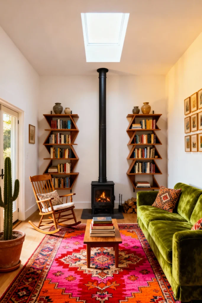 Center the room around a tall, black wood-burning stove to create an instant heart for the home. Install unique zigzag floating shelves on either side to display your favorite hardcover books and ceramic pottery. Choose a lush, velvet sofa in a deep moss green to bring richness to the seating area. Layer a bright, patterned rug in shades of pink and orange underneath to inject vibrant energy. Finish the look with a classic wooden rocking chair and a tall cactus to keep the vibe organic and inviting.