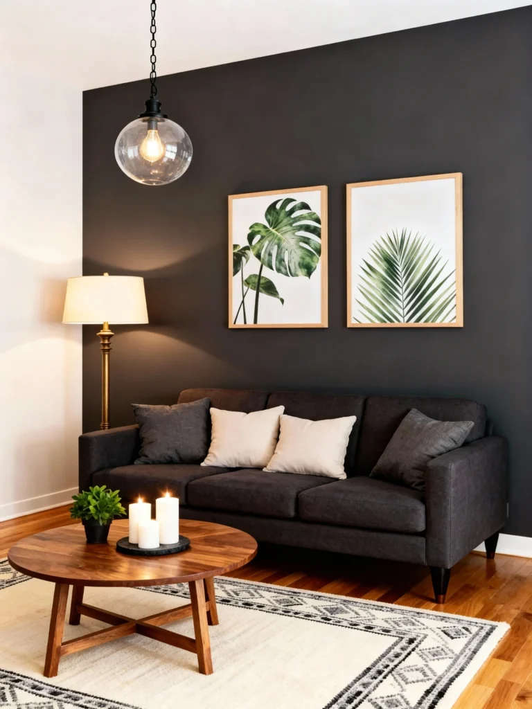 Paint a feature wall in a matte charcoal or black to create dramatic depth. Hang two large, light-framed botanical prints against the dark backdrop to make the green leaves pop. Choose a simple, structured grey sofa and pile on linen pillows in neutral oatmeal tones. Center a round, wooden coffee table on a cream rug with geometric black detailing to tie the floor to the wall. illuminate the space with a glass globe pendant light and a cluster of pillar candles for an intimate, moody atmosphere.