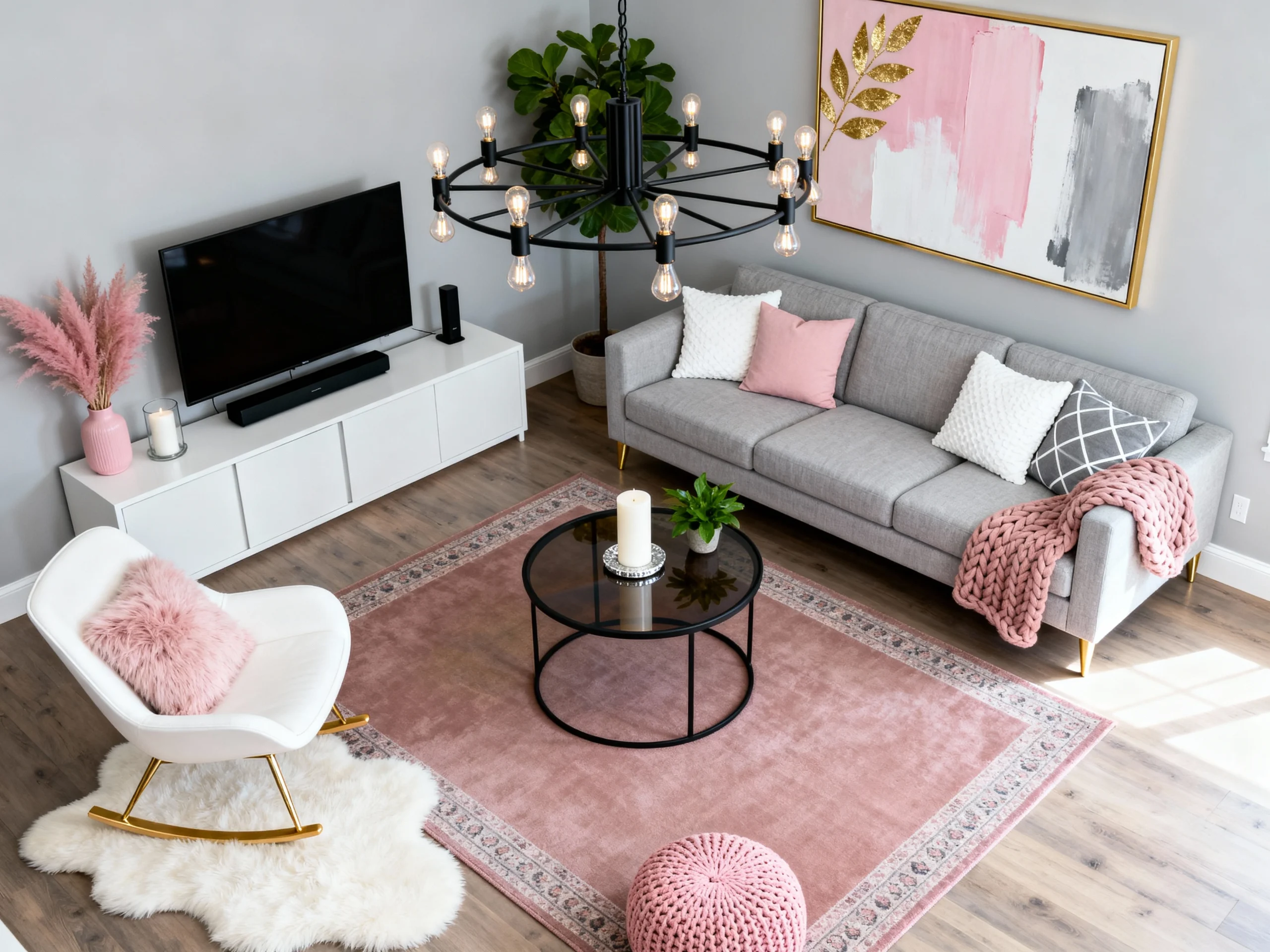 Embrace the softer side of design with a palette of greys and dusty pinks. Hang a large abstract canvas featuring blush, white, and gold leaf textures above the sofa. Arrange a light grey sectional with an assortment of faux fur and pink velvet throw pillows. Drape a chunky, pink knit blanket over the side for immediate coziness. Center the room with a sleek, black glass coffee table to add a touch of modern edge. illuminate the space with an industrial-style chandelier with exposed bulbs for a hint of contrast.