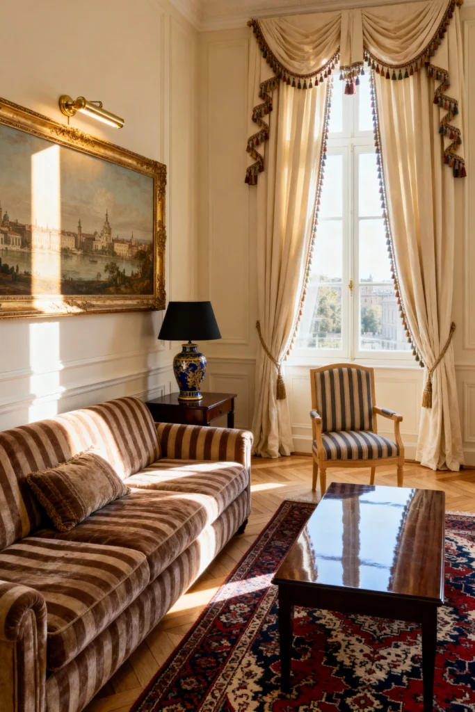 For a touch of old-world luxury, pair a brown-and-tan striped velvet sofa with a rich, dark wood coffee table. Lay down a vibrant red-and-blue Persian rug to anchor the space and add a pop of regal color. Frame the view with dramatic, floor-to-ceiling cream curtains adorned with multicolored tassels for a truly ornate feel. Complete the look with a large, gold-framed landscape painting lit by a dedicated picture light to make the room feel like a private gallery.