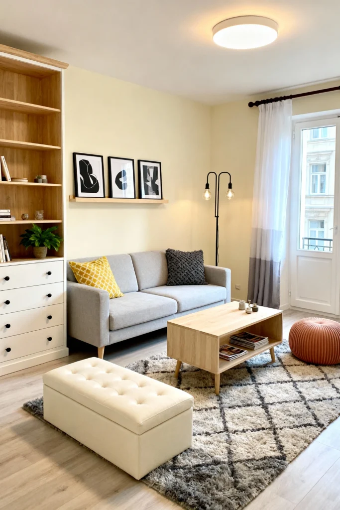 If you love clean lines and functional beauty, opt for a light grey sofa and a blonde wood coffee table with open shelving. Use a large, shaggy diamond-patterned rug to add warmth and texture to the light wood floors. Keep decor minimal with a few black-and-white abstract prints and a double-headed black floor lamp for a touch of industrial edge. A cream-colored tufted ottoman and a textured orange pouf provide extra seating without cluttering up this serene, organized sanctuary.