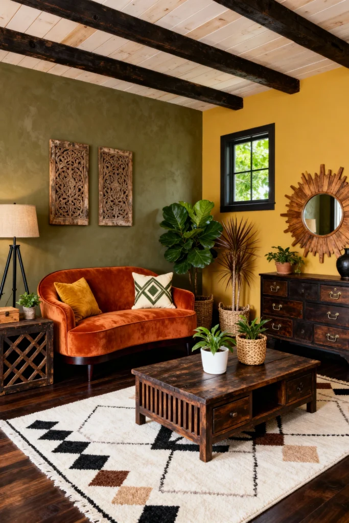Embrace deep, moody tones by pairing an olive green accent wall with a burnt orange velvet loveseat. Introduce natural elements like dark wood beams on the ceiling, a sunburst mirror made of wood slats, and plenty of leafy plants in woven baskets. A cream rug with black and brown geometric diamonds adds a tribal-inspired touch. This look is all about layering textures and warm colors to create a cozy, grounded space that feels connected to the outdoors.