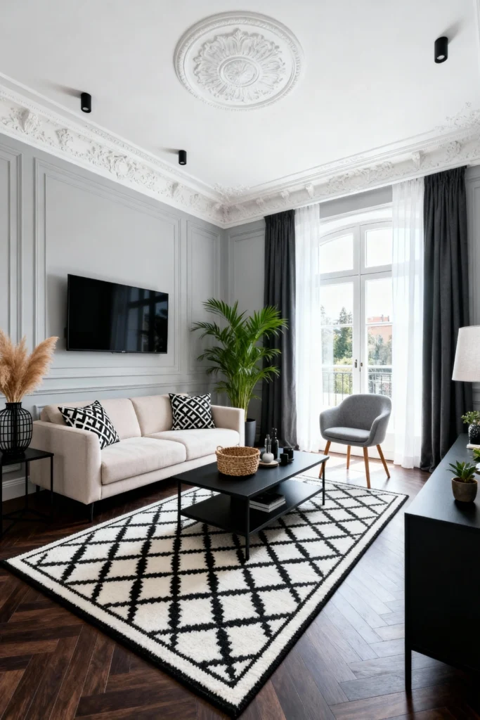 For a high-contrast, modern look, set a cream sofa against cool grey walls with elegant picture frame molding. Use a bold black-and-white lattice rug and matching geometric pillows to create a sharp, graphic vibe. Ground the room with dark herringbone wood floors and a sleek black coffee table and media console. A tall, vibrant green palm and an ornate ceiling medallion add just the right amount of organic life and architectural detail to this polished space.