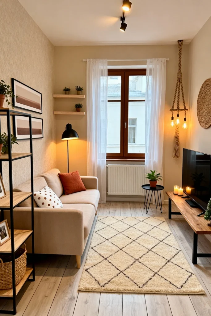 Make the most of a narrow room with a compact beige sofa and a slim, wooden bench used as a TV stand. Add character with a unique rope-hung pendant light and floating blonde wood shelves for small potted plants. A terracotta-colored pillow and framed desert landscape prints bring in a touch of warmth. Using sheer white curtains allows natural light to flood the space, keeping this small but thoughtfully decorated nook feeling open and incredibly inviting.