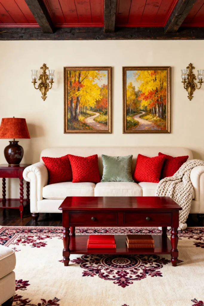Create a cozy, classic atmosphere with a cream sofa accented by deep red textured pillows and a chunky knit throw. Use dark wood furniture—like a coffee table and a spindle-leg side table—to add a sense of history. Hang a pair of matching forest path paintings and golden wall sconces for a symmetrical, balanced look. The dark red ceiling and ornate cream rug with burgundy details tie the whole room together in a warm, sophisticated embrace.