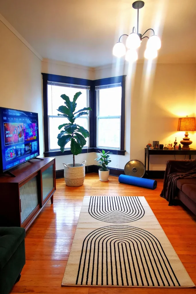 Embrace that cozy, lived-in feel! Start with a bold, geometric rug featuring black arching lines to draw the eye inward. Place a massive Fiddle Leaf Fig in a woven seagrass basket near the window to soak up that natural light. For your tech, go with a mid-century wooden media console with fluted glass doors to hide the wires. Toss a chocolate-brown velvet throw over your sofa for instant warmth. It’s all about mixing natural textures with clean lines to create a space that feels fresh and incredibly relaxing.