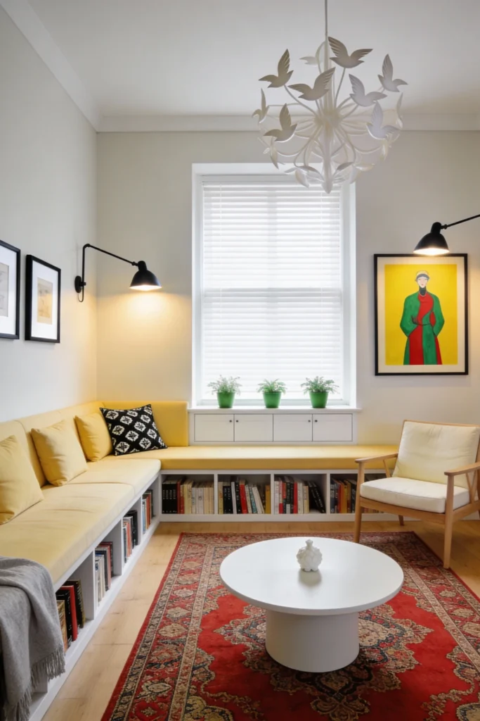 Turn a corner into the ultimate reading nook. Install a custom L-shaped bench in a cheerful buttercup yellow, with built-in cubbies underneath to house your entire book collection. Lay down a classic red Persian rug to give the room some historic weight and character. Hang a whimsical, bird-inspired chandelier to act as a conversation piece. Use black swing-arm wall lamps to provide targeted light for late-night reading sessions. It’s a bright, intellectual space that proves you don’t need a separate room to have a library.
