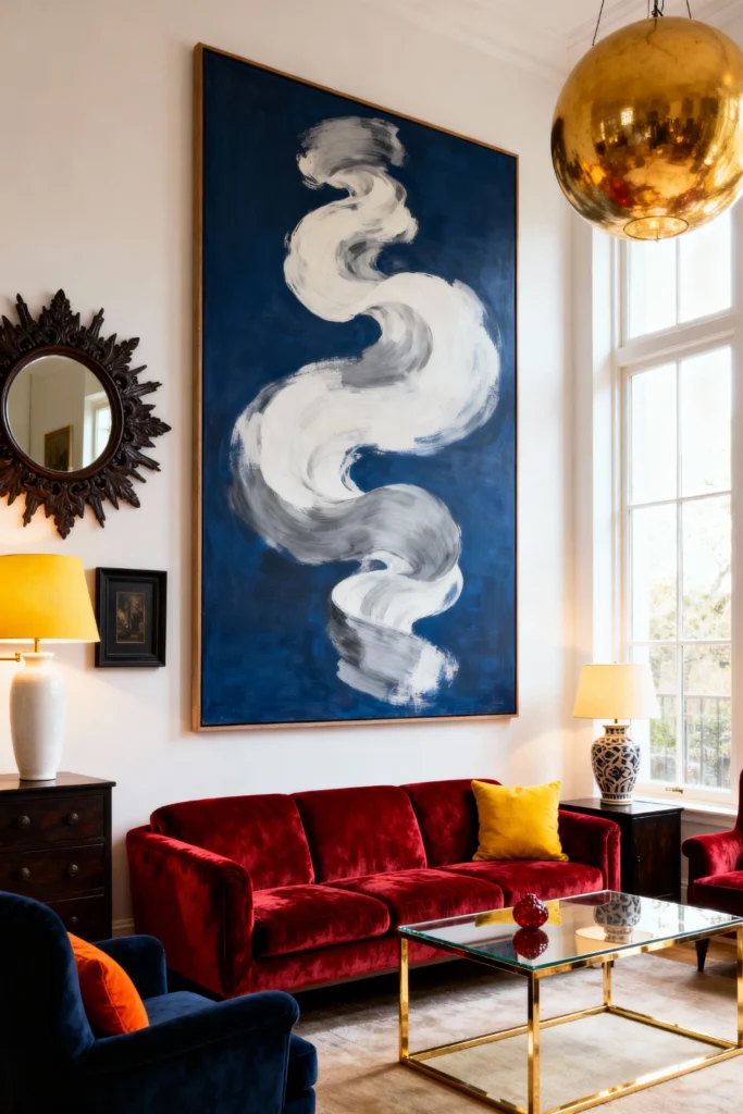 Go big or go home! Pick a deep, ruby-red velvet sofa as your centerpiece and pair it with a massive, abstract blue-and-white canvas that reaches toward the ceiling. Add a touch of glam with a gold-framed glass coffee table and a matching oversized brass globe pendant light. Mix in a navy blue armchair and a sunburst mirror to create a high-contrast, gallery-like atmosphere. This look is all about confidence—don’t be afraid to mix primary colors if you keep the furniture shapes elegant and structured.