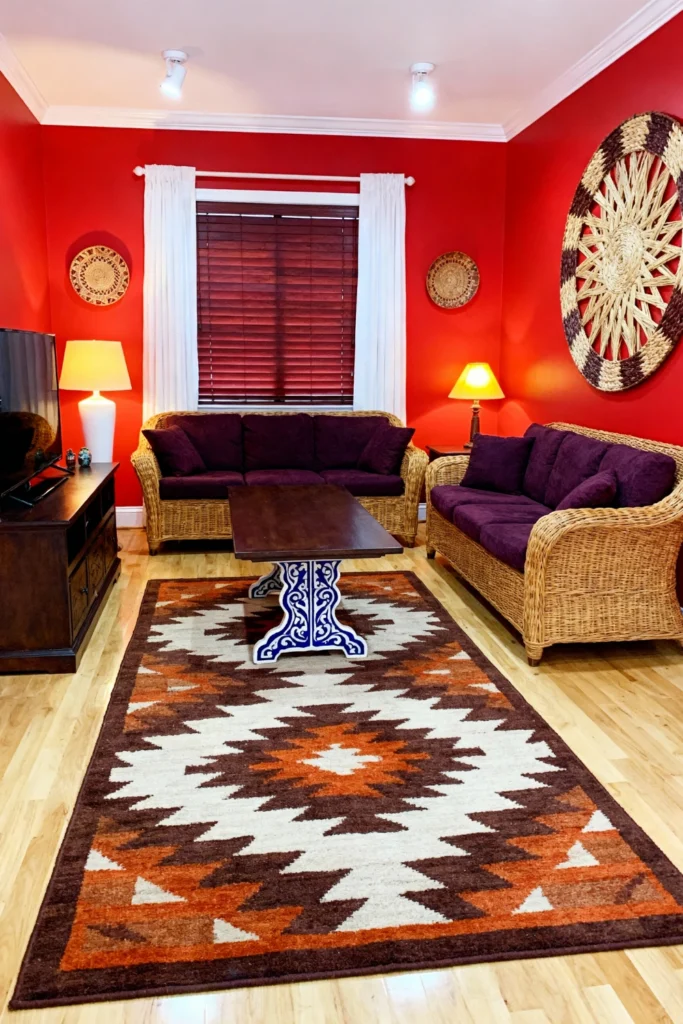 If you love warmth, paint your walls a bold, saturated red. Balance the intensity with natural wicker sofas topped with deep purple cushions for a tropical-meets-regal vibe. Lay down a large, Southwestern-style patterned rug in oranges and browns to tie the earthy tones together. Hang woven sun-disk wall art to add texture and a global feel. This room is perfect for someone who wants their home to feel like a permanent vacation—full of energy, life, and a touch of the unexpected.