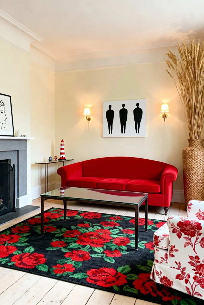 Want to mix “classy” with “cool”? Start with a curved, lipstick-red sofa and set it against soft cream walls. The real secret here is the rug: choose a black base with oversized red rose patterns to ground the space. Add a quirky lighthouse figurine on a slim side table for a bit of personality. Balance the bold reds with a tall, dried wheat arrangement in a floor vase to add some height and organic texture. It’s a playful, sophisticated take on traditional floral decor.