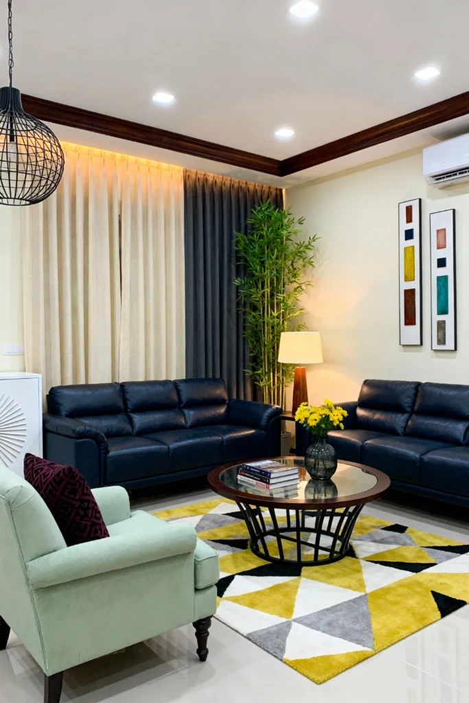 Create a lounge vibe with a pair of navy blue leather sofas. Contrast them with a pale mint-green armchair to keep the room from feeling too heavy. Use a bold, geometric rug in yellow, grey, and black to add a pop of sunshine to the floor. Soften the windows with two-tone curtains—light beige on one side and charcoal on the other—to control the mood. A tall bamboo plant in the corner adds a burst of life, making this the perfect spot for an evening cocktail.