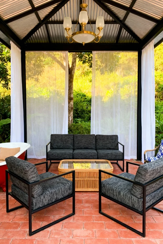 Frame a covered brick patio with breezy, sheer white curtains to soften the space. Anchor the room with a modern, matte black metal sofa and chairs, outfitted with textured charcoal gray cushions. Place a light, woven rattan coffee table in the center to add a touch of natural, organic warmth to the sleek furniture. Hang a classic, brass-accented chandelier from the corrugated ceiling to bring a surprising touch of indoor elegance outside. Let the sheer drapes gently filter the bright sunlight shining through the lush garden beyond.