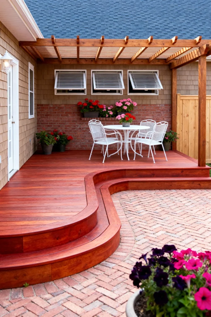 Build a rich, cherry-toned wood deck with smooth, sweeping curved steps that lead down to a classic herringbone brick patio. Set up a delicate, vintage-inspired white metal table and chairs right against the brick wall for a charming cafe vibe. Build a sturdy wooden pergola overhead to provide dappled shade. Line the brick ledge with window boxes overflowing with vibrant pink and red geraniums. Add rustic metal buckets filled with more blooming flowers around the edges to give the space a beautiful, lush garden feel.