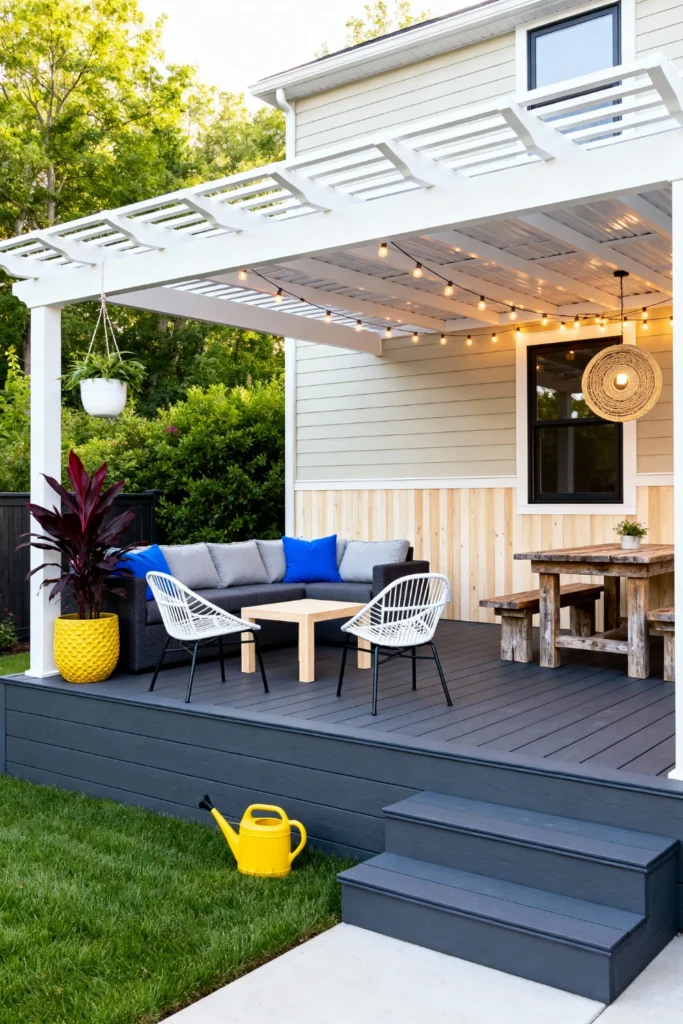 Build a crisp, white painted pergola over a modern, slate-gray composite deck. Tuck a comfortable charcoal sectional into the corner, and bring it to life with shockingly bright, cobalt blue throw pillows. Place two airy, white wire lounge chairs opposite the sofa to keep the visual weight light. Introduce a stunning pop of color with a bright, sunshine-yellow textured planter holding a dramatic red-leafed tropical plant. Hang a statement woven pendant light and string up classic bulb lights to make this vibrant hangout space glow beautifully.