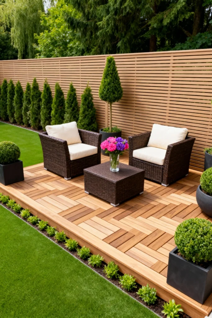 Opt for a stunning parquet-style wooden deck to instantly elevate your backyard’s style. Set up a pair of rich, espresso-brown wicker chairs with plush cream cushions for a sophisticated seating area. Place a matching square coffee table between them, topped with a glass vase of bright pink and purple hydrangeas. Enclose the space with a sleek, horizontal-slatted privacy fence to create an intimate, secluded feel. Border the deck with neat, modern black planters filled with perfectly rounded boxwoods to frame the area with crisp, clean greenery.
