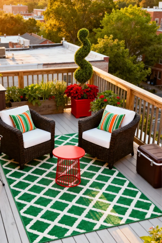 Liven up your deck with a bold, emerald green patterned area rug to define your seating zone. Flank it with two dark, woven armchairs topped with crisp white cushions and cheerful striped pillows. Place a bright, candy-apple red wire side table right in the middle to give the space a fun, playful pop of color. Line the wooden railings with natural planter boxes filled with lush greenery and vibrant red blooms. Add a quirky spiral topiary in a matching red pot to give your urban oasis a whimsical, tailored touch.
