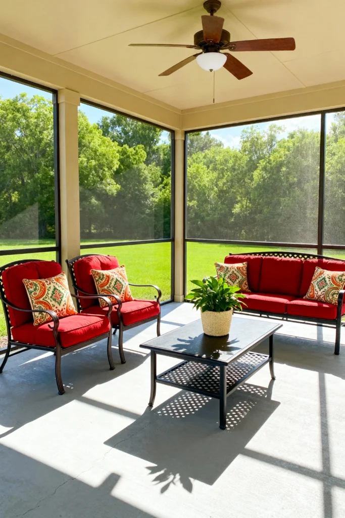 Choose a comfortable metal patio set featuring plush, cherry-red cushions to instantly brighten up your screened-in porch. Add patterned throw pillows for an extra layer of personality and coziness. Place a simple, glass-topped coffee table in the center to hold your morning coffee or an afternoon read. Top the table with a lush, potted green plant in a woven basket to blur the lines between indoors and out. Install a classic ceiling fan overhead to keep a gentle, refreshing breeze flowing through the space on those lazy summer afternoons.