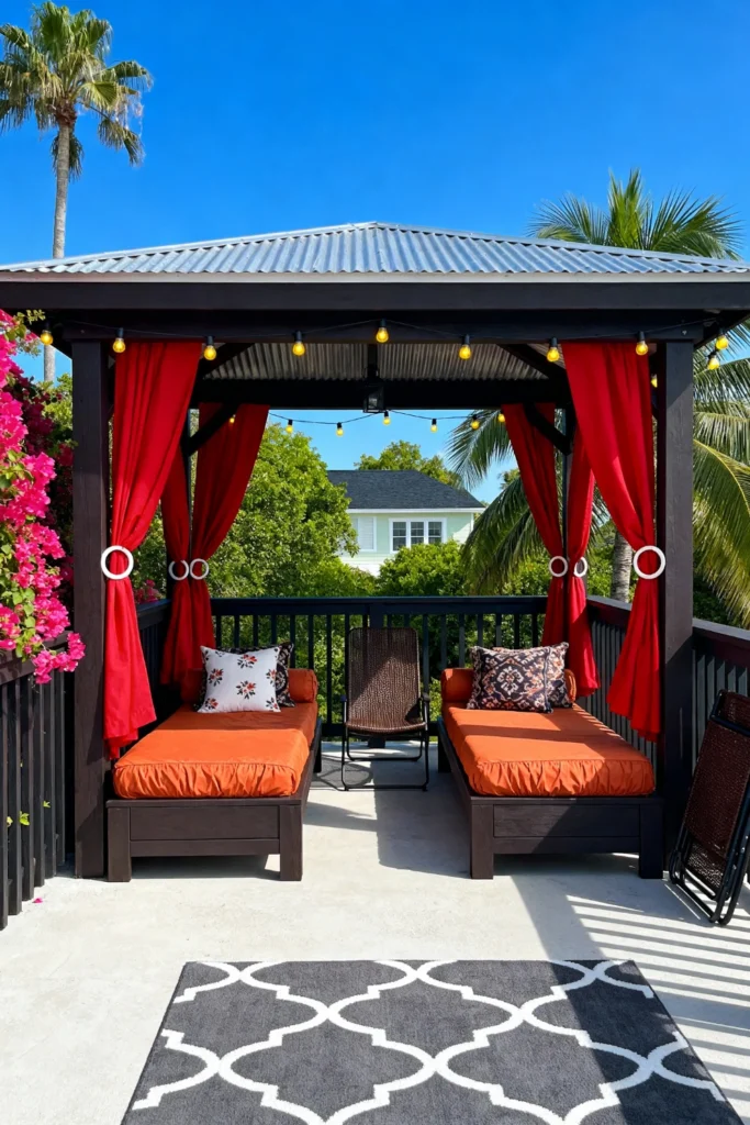 Create a luxurious resort feel right at home by setting up a dark wood gazebo. Hang dramatic, bright red curtains that you can tie back with modern white rings to frame the view. Slide in two deep wooden chaise lounges, topping them with thick, burnt-orange cushions for maximum lounging comfort. Toss on some contrasting patterned throw pillows to tie the warm color palette together. String a row of cheerful, round café lights right under the corrugated metal roof to ensure the tropical vacation vibes keep flowing after the sun goes down.