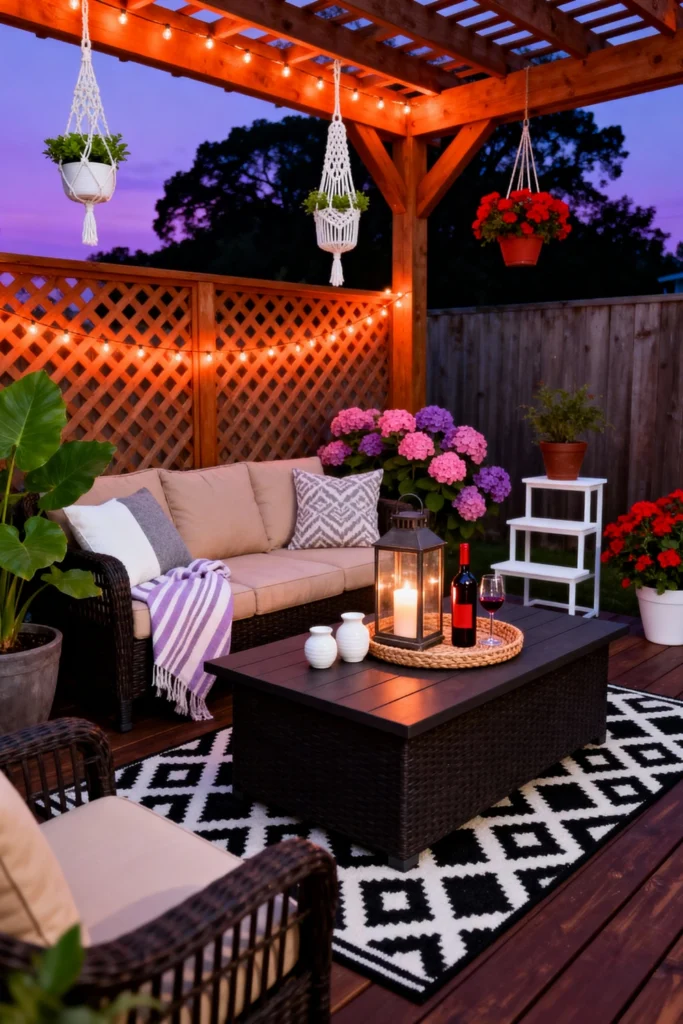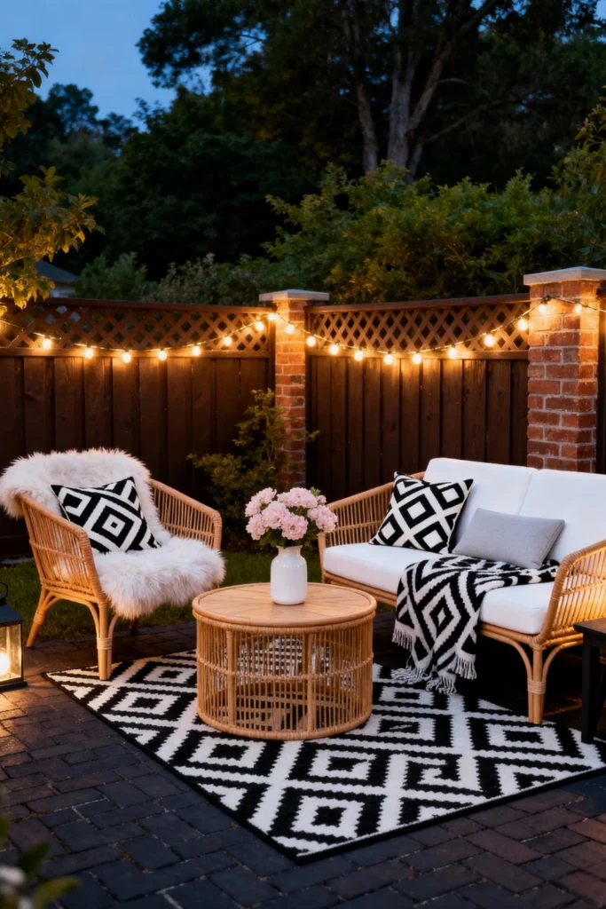 Set a magical evening mood with warm string lights draped loosely across a wooden pergola. Hang white macrame planters at varying heights to draw the eye upward and add a bohemian touch. Choose a wicker sofa set with neutral beige cushions, then ground the space with a bold black and white geometric rug. Add a large, glass-encased lantern with a pillar candle on the table for a romantic, flickering centerpiece.