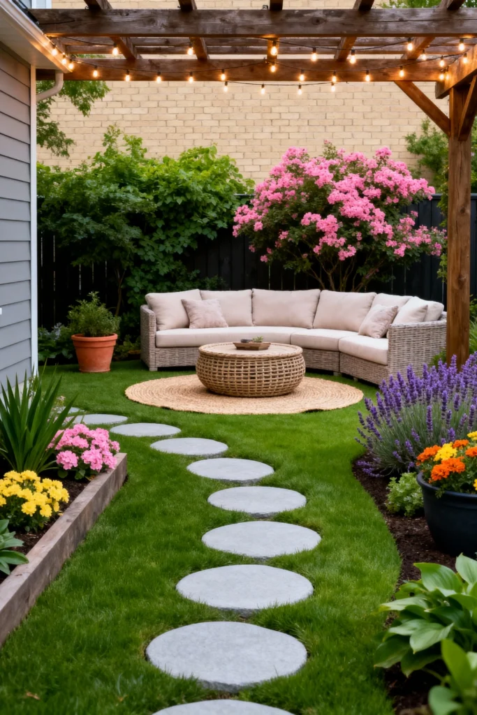 Soften the lines of your yard with a curved wicker sofa that hugs the garden beds. Lay a circular jute rug directly on the grass to anchor the seating area naturally. Create a whimsical journey with round stone pavers leading through the lush green lawn to the seating zone. Plant fragrant lavender and pink flowering bushes nearby to engage all your senses while you relax under the wooden beams.)