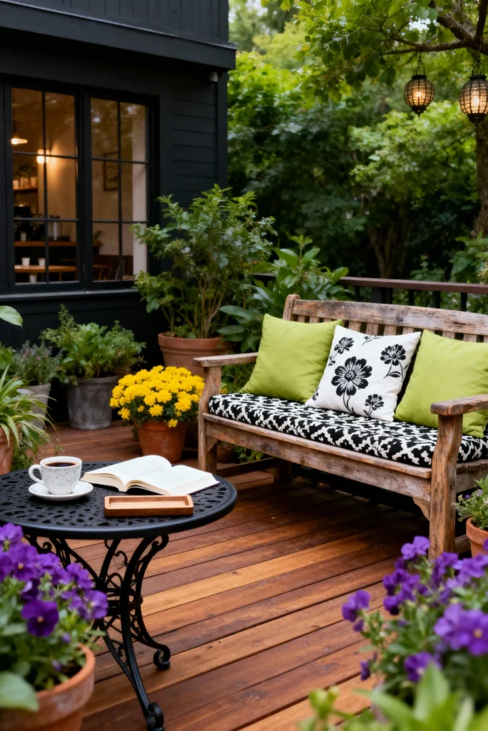 Carve out a quiet reading spot against a dark, charcoal exterior wall for a moody, sophisticated vibe. Use a weathered, rustic wooden bench piled with pillows in varied floral patterns for comfort. Set a black cast-iron table nearby for your coffee cup and favorite book. Surround yourself with terracotta pots filled with bright yellow mums and purple pansies to soften the dark architectural lines with bursts of organic color.