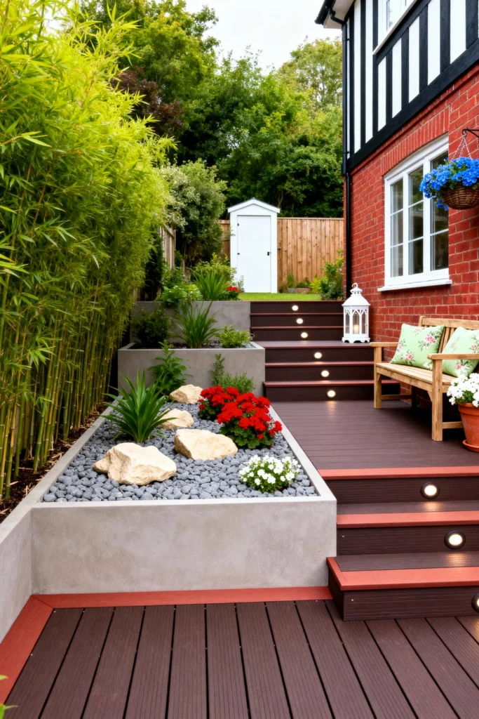 Create depth and visual interest with a multi-level deck design. Install integrated LED riser lights on the stair treads for safety and a sleek, modern aesthetic at night. Use built-in concrete planters filled with smooth grey pebbles and vibrant red geraniums to break up the wood tones. Plant tall, dense bamboo along the fence line for an instant, fast-growing privacy screen that whispers in the wind and blocks out the neighbors.